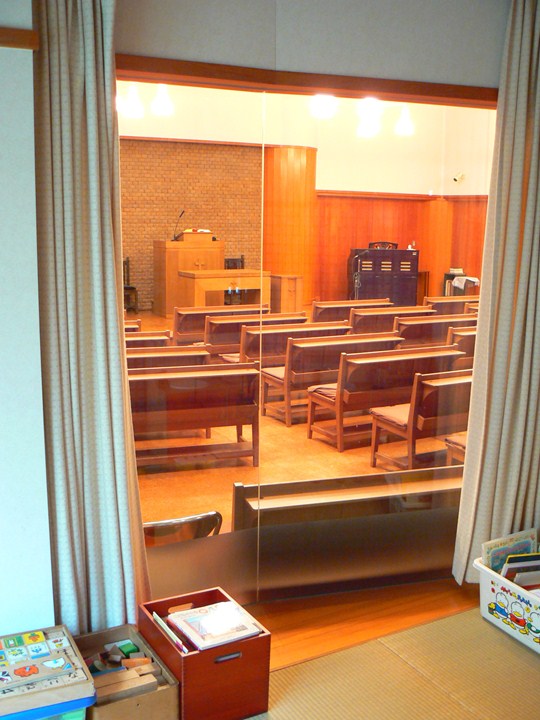 親子室は礼拝堂後ろに設置されています。畳敷きで、約4畳半ほどの広さがあります。ガラスで仕切られていますが、音響設備と空調が完備されていますので、小さなお子様とご一緒でも安心して礼拝に参加していただけます。おもちゃや絵本もご自由にお使いください。もちろん、礼拝堂でご一緒に礼拝に参加していただいても構いません。