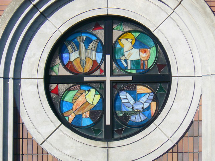 会堂外壁の正面にあります。左上から時計回りに、鳩、小羊、魚