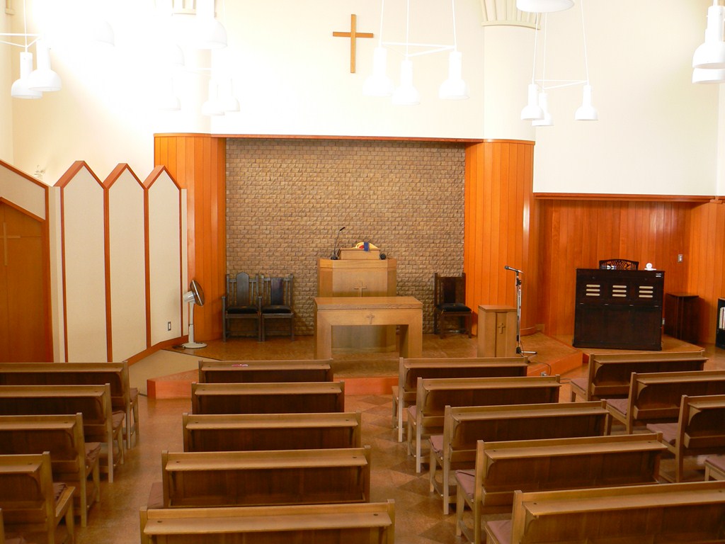 現会堂は1995年に献堂されました。 木材をふんだんに使用し、質素で明るい雰囲気の礼拝堂になりました。天井が高いため、音響もよく、時々コンサートホールとしても使われています。長椅子は会堂新築後もそのまま使用していましたが、老朽化のため2009年に新調されました。なお、礼拝堂は保育園の礼拝や集会などにも使われています。